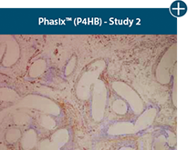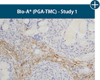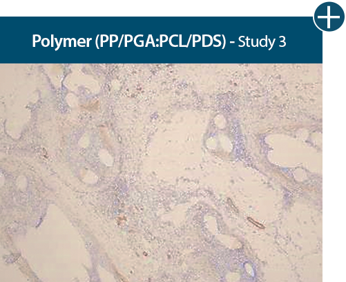 Alpha-smooth muscle actin (α-SMA)–positive capsule forms around the synthetic fibers as part of the foreign-body response, which is stained brown in the examples below. This indicates the formation of scar tissue, which may be weak and contractile. 4-8