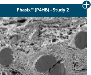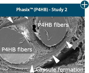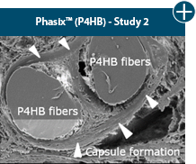 Capsule formation around the synthetic fibers was demonstrated in scanning electron microscopy images, which may contribute to mesh contraction in vivo. White arrows depict a denser and more pronounced capsule at 6 months for P4HB mesh.5-7